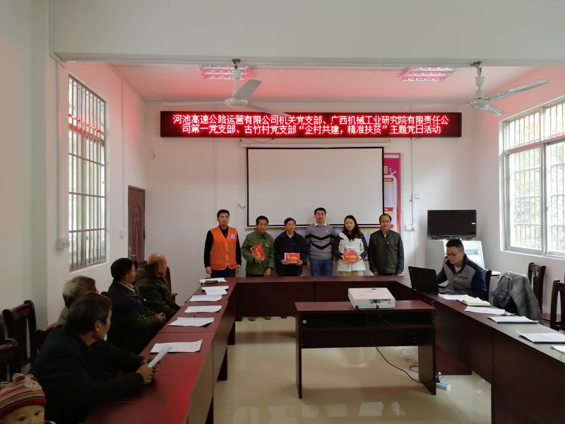 為激發(fā)支部黨建工作新活力,錘煉提升企業(yè)黨員黨性修養(yǎng),強化黨建引領,助力脫貧攻堅,推動黨建工作與扶貧工作相互促進。11月28日,廣西機械工業(yè)研究院有限責任公司第一黨支部前往大化縣扶貧點七百弄鄉(xiāng)古竹村,與河池高速公路運營有限公司機關黨支部、古竹村黨支部聯(lián)合開展“企村共建,精準扶貧”主題黨日活動。