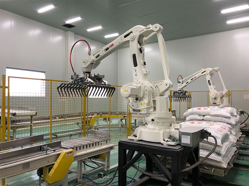 糖廠(chǎng)使用碼垛機(jī)器人生產(chǎn)線(xiàn)現(xiàn)場(chǎng)