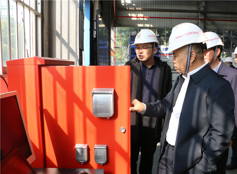 白雷部長參觀公司展廳,到智能制造車間檢查指導安全生產工作,了解機械院自主研發的智慧電箱、綠籬修剪機器人、全自動錐桶擺放機器人等產品