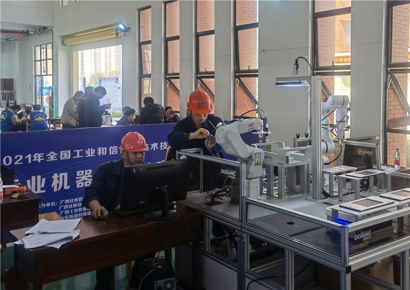 機械院李永成、李修明組成的競賽隊伍,參加了由自治區工業和信息化廳等5部門聯合舉辦的2021年全國工業和信息化技術技能大賽廣西選拔賽。本次為兩人首次搭檔參加該類型比賽,經過激烈角逐,從工業機器人系統維護員(工業機器人技術應用)賽項職工組8個參賽隊伍中脫穎而出,獲得了總分第一的好成績。