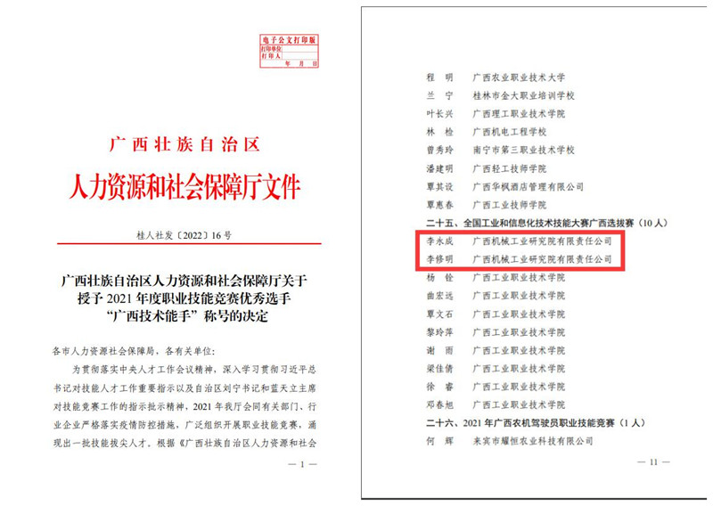 近日,廣西壯族自治區人力資源和社會保障廳印發了《關于授予2021年度職業技能競賽優秀選手“廣西技術能手”稱號的決定》,向在2021年度自治區級職業技能競賽中取得優異成績的選手授予“廣西技術能手”稱號。機械院李永成、李修明2名同志憑借在2021年度自治區級職業技能競賽中的突出表現,在此次表彰中獲此殊榮。